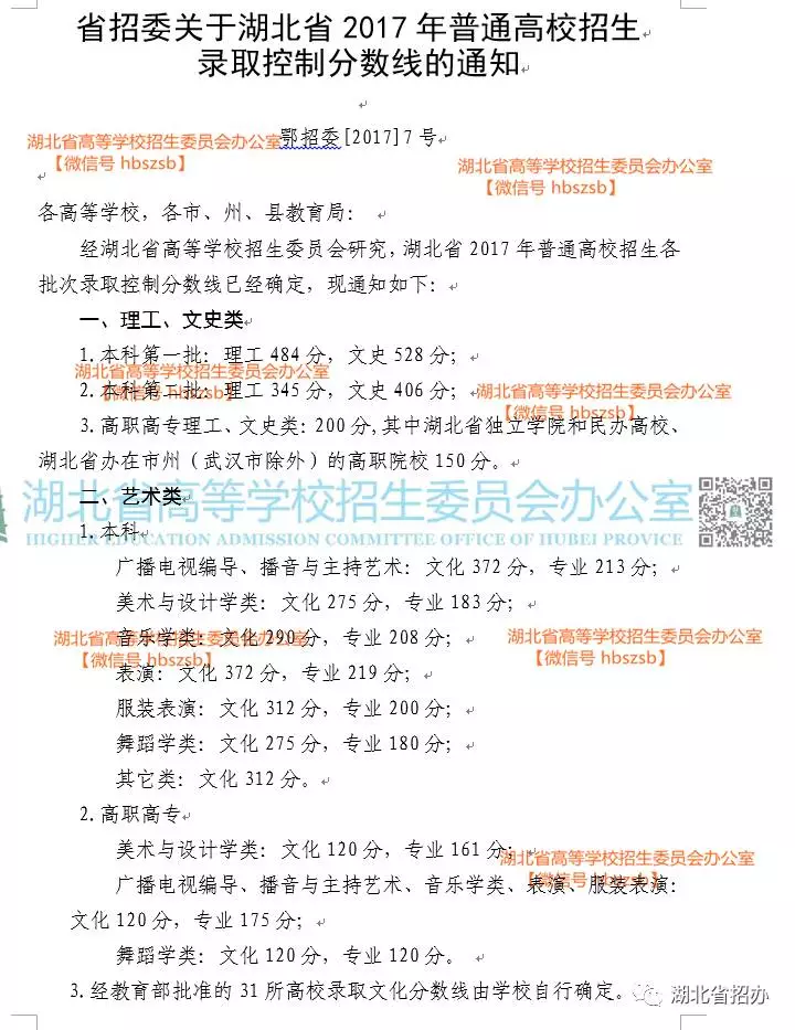 2017年普通高校招生錄取控制分?jǐn)?shù)線