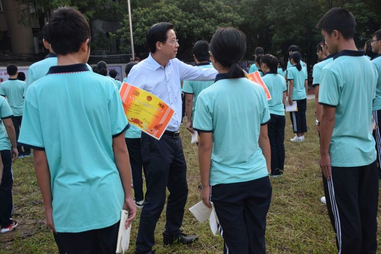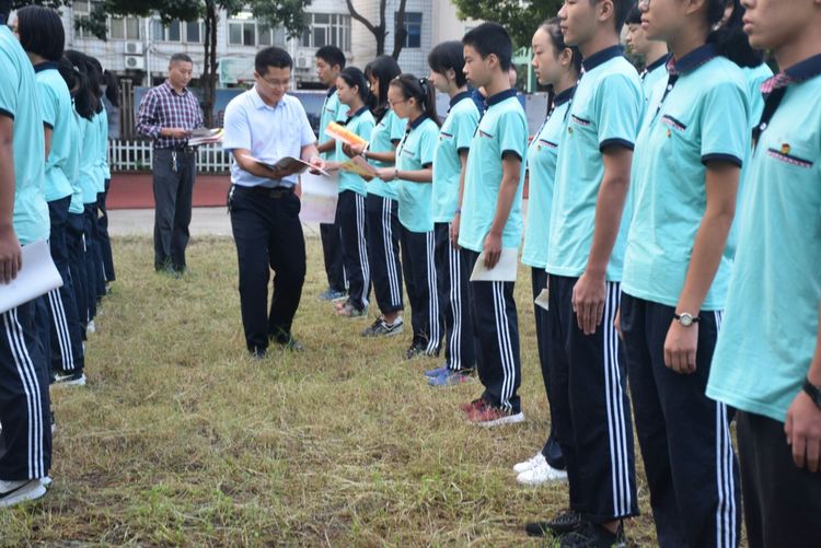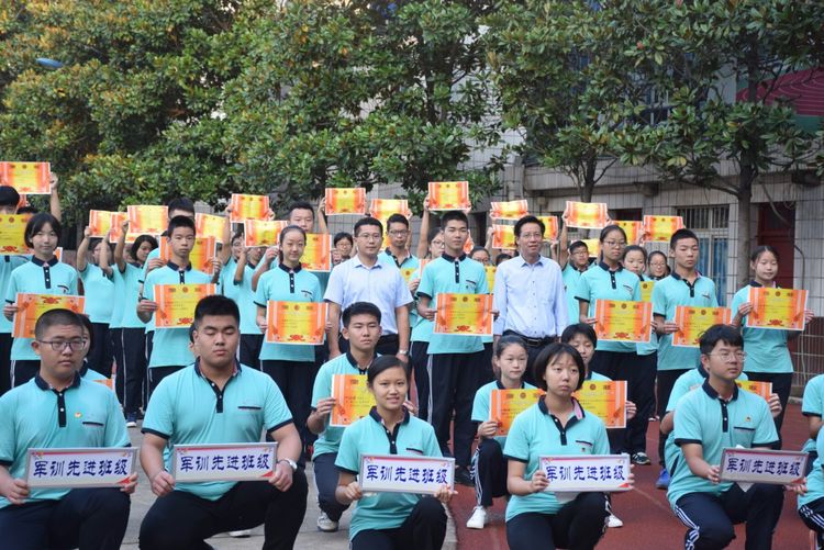 李校長代表學(xué)校,給高一軍訓(xùn)中的優(yōu)秀班級和學(xué)員們頒獎。