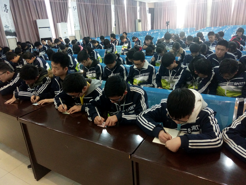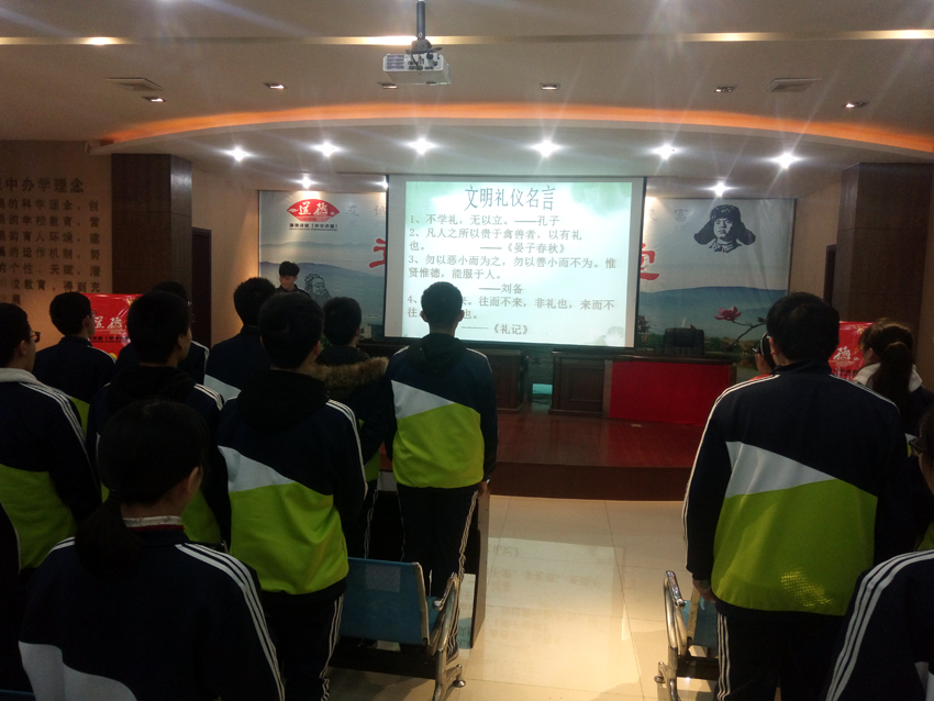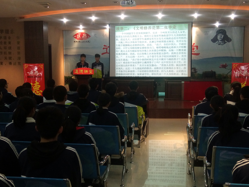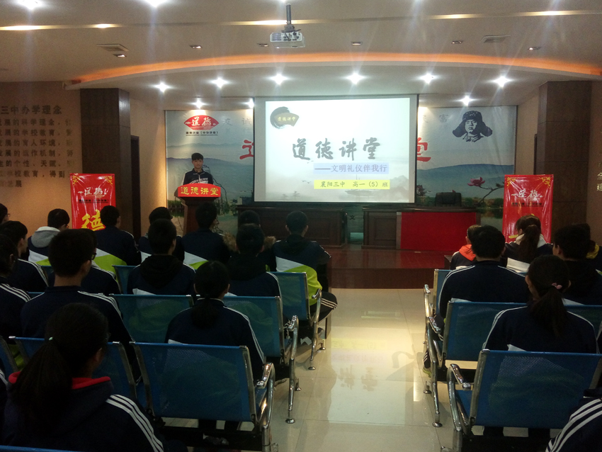 2017年11月25日下午,襄陽三中道德講堂在學校道德講堂活動室開講,本期道德講堂的主題是“文明禮儀伴我行”,主講人為高一(5)班班主任汪金順老師,活動第一個環(huán)節(jié)唱歌曲,同學們起立合唱溫暖而熟悉的歌曲《文明在哪里》。隨后,主持人聲情并茂介紹了文明禮儀的知識,講述道德故事,全體同學誦讀了經(jīng)典,并寫下感悟和承諾,最后,學生們在留言板上用便簽貼拼成了“文明”,并表示要將“文明”留在心中,讓文明禮儀隨行。