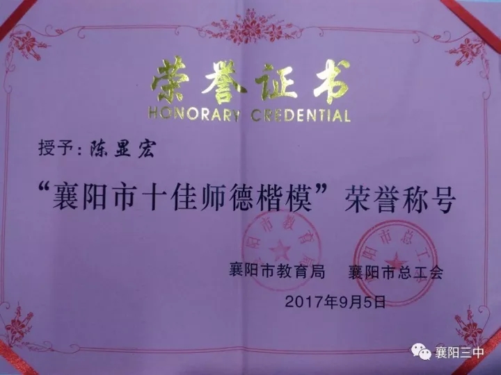 學(xué)校努力提升教師的獲得感,引導(dǎo)老師享受教育,做一名有幸福力的老師。學(xué)校抓好師德建設(shè),打造教師的“精神特區(qū)”,大力培養(yǎng)和倡導(dǎo)教師的責(zé)任意識(shí)和敬業(yè)奉獻(xiàn)精神,樹(shù)立崇高的人生觀、價(jià)值觀。充分挖掘?qū)W科帶頭人和骨干教師的資源,發(fā)揮其在教學(xué)活動(dòng)和教科研活動(dòng)中的示范和引領(lǐng)作用。引導(dǎo)青年教師樹(shù)立終身學(xué)習(xí)的理念,走“合格——升格——風(fēng)格”的成長(zhǎng)之路。2017年,學(xué)校名師輩出,何志平、陳芳被評(píng)為“襄陽(yáng)市名師”,彭紅偉獲準(zhǔn)建設(shè)“襄陽(yáng)市名班主任工作室”,陳顯宏榮獲“襄陽(yáng)市十佳師德標(biāo)兵”稱(chēng)號(hào),彭紅偉、孫愛(ài)勇被評(píng)為“襄陽(yáng)市優(yōu)秀班主任”。