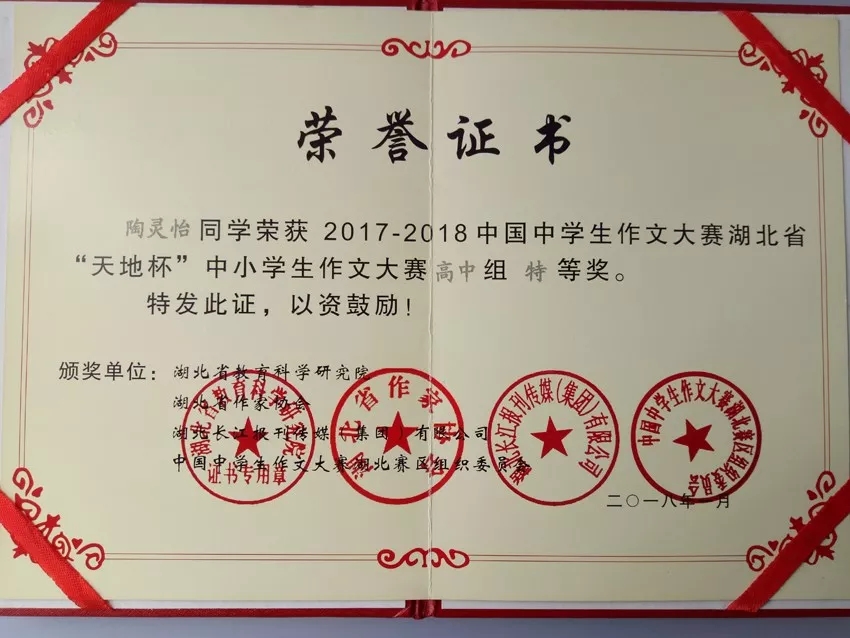 近日,由省教育科學研究院、省作家協(xié)會等聯(lián)合主辦的第13屆“天地杯”中學生作文大賽湖北賽區(qū)結果揭曉。我校數十名同學獲得省級榮譽,其中,常耀陽、陶靈怡斬獲省特等獎,李楠欣、韓澤彬斬獲省一等獎。