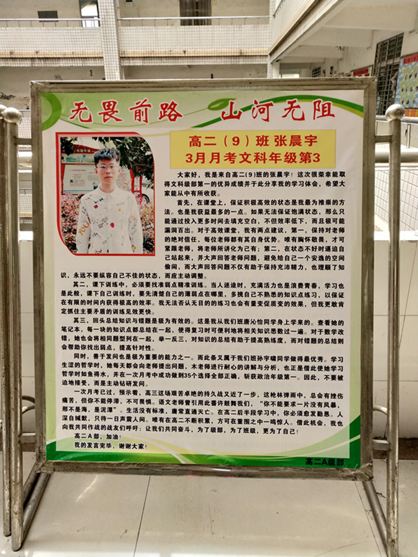 大家好,我是來自高二(9)班的張晨宇!這次很榮幸能取得文科級部第一的優(yōu)異成績并于此分享我的學(xué)習(xí)體會,希望大能從中有所收獲。
