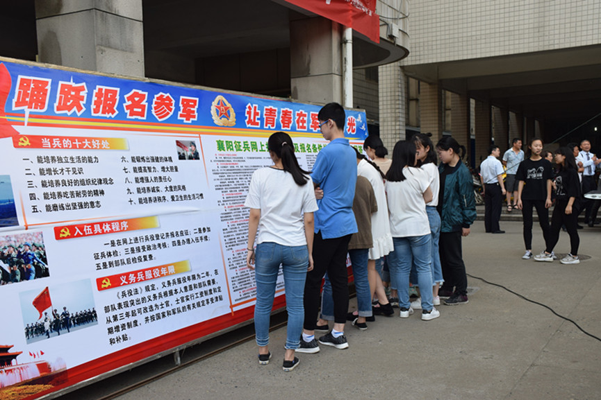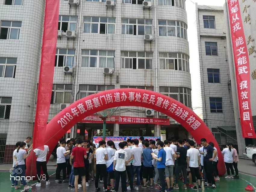 為加強(qiáng)愛(ài)國(guó)主義和國(guó)防教育,落實(shí)《襄陽(yáng)市2018年度征兵工作實(shí)施方案》的文件精神,切實(shí)做好征兵宣傳工作,5月16日,屏襄門(mén)街道辦事處聯(lián)合我校開(kāi)展了“征兵宣傳進(jìn)校園”活動(dòng),主題是“貫徹實(shí)施國(guó)防法規(guī),自覺(jué)履行國(guó)防義務(wù)”。街道辦事處工作人員向前來(lái)咨詢(xún)的高二、高三年級(jí)同學(xué)認(rèn)真講解襄陽(yáng)市征兵工作的流程,為有意投身軍旅的同學(xué)們解惑答疑。