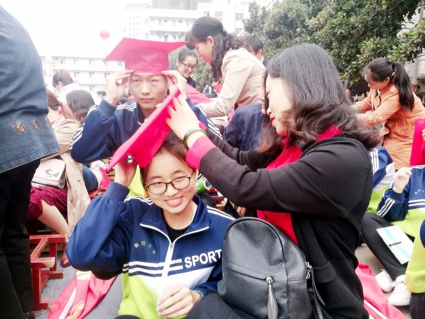 飽含著家長對孩子的摯愛家長親自給孩子戴上成人帽