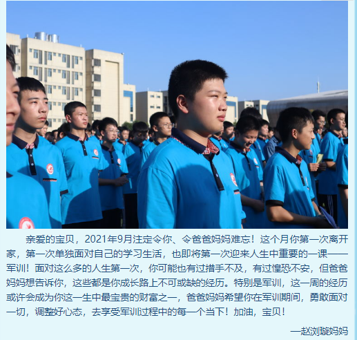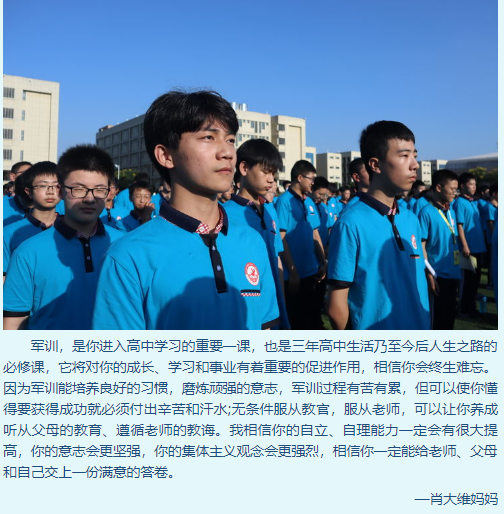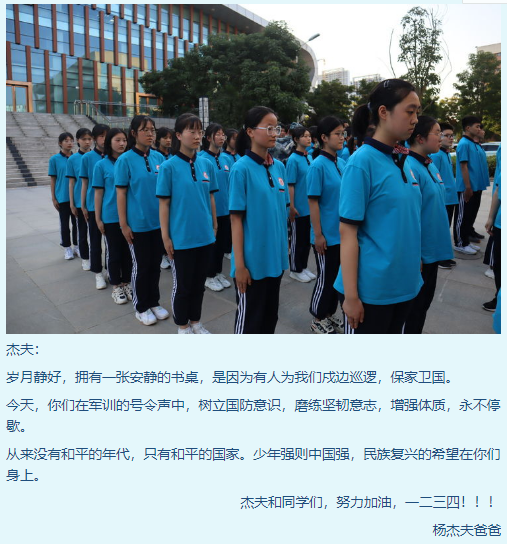 本次軍訓以國防知識、校史校情、行為規(guī)范、隊形隊列為內(nèi)容,把學校教育與“軍訓”教育緊密結合起來,采取課內(nèi)教育和實踐活動相結合的方法,提高學生綜合素質(zhì),為把學生培養(yǎng)成合格高中生、合格公民及優(yōu)秀公民奠定基礎。對于軍訓工作,高一年級的家長們也表現(xiàn)了極高的關注。高一(18)班的部分家長寫下對孩子的祝福和殷切希望,體現(xiàn)出廣大家長對學校軍訓工作的支持和肯定。