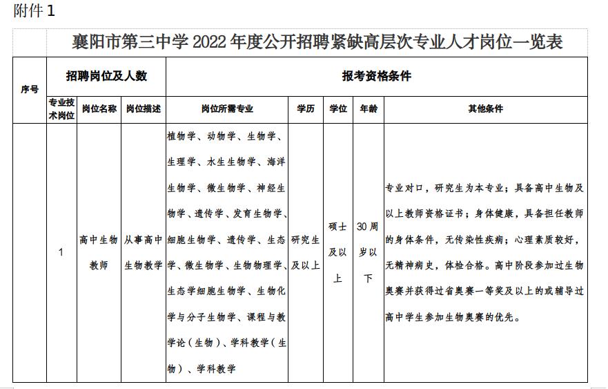 (一)襄陽市第三中學(xué)擬公開招聘緊缺高層次專業(yè)人才 1名。崗位條件詳情見《襄陽市第三中學(xué)2022年度公開招聘緊缺高層次專業(yè)人才崗位一覽表》。